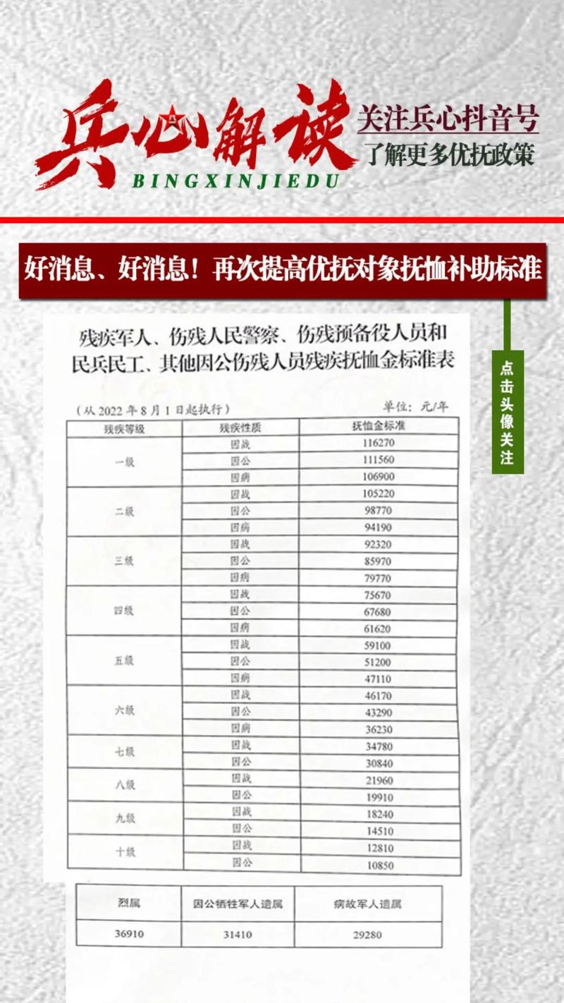我們期待殘疾軍人的優(yōu)撫政策能夠進一步完善和落實,除了提高撫恤金和生活補貼外,還需要關(guān)注他們的就業(yè)、教育、醫(yī)療等方面的問題,我們建議政策制定者繼續(xù)加大力度,推出更多針對性的政策,以滿足殘疾軍人的需求,我們也呼吁社會各界能夠持續(xù)關(guān)注和支持殘疾軍人,讓他們感受到社會的溫暖和關(guān)懷,讓我們共同致敬這些英雄,為他們點贊,并將這份關(guān)懷與支持延續(xù)下去,為構(gòu)建一個更加和諧、美好的社會貢獻力量。