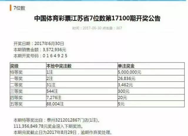 江蘇七位數(shù)的中獎案例